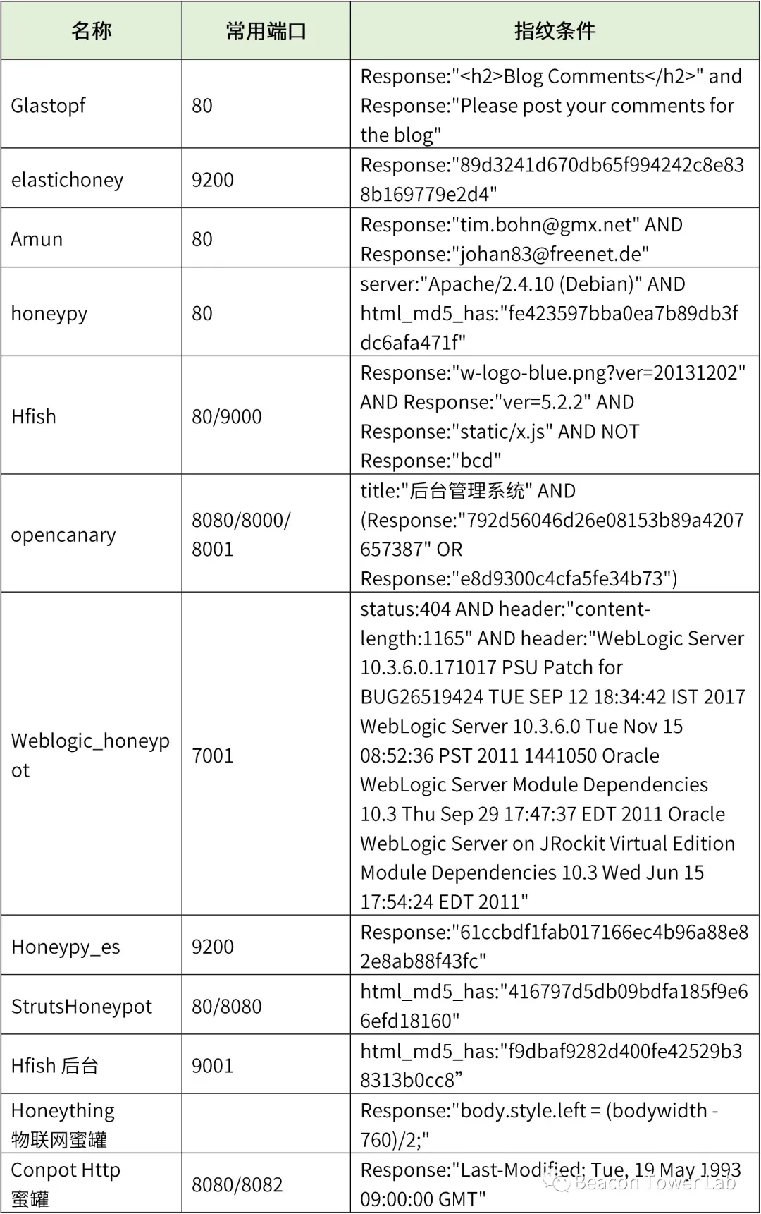 指纹通常是鉴定一个业务系统最直接的方式,因此对蜜罐而言也一定会留下属于它的独特指纹信息,例如下面的一些开源蜜罐的指纹信息: